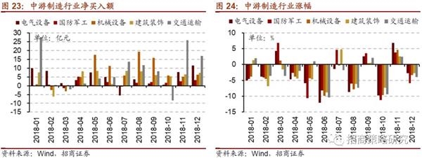 中游制造业中,虽然从2018年各月来看,机械设备行业市场表现一般,但是在4~12月外资持续加仓该行业股票,行业市值配比也已经连续9个月提升,目前处于2017年以来的最高水平。除3月和10月外,北上资金均加仓交通运输行业,尤其1月和11月净买入超过25亿元。另外,11月以来,电气设备表现强势,部分个股连创新高,吸引外资积极加仓。