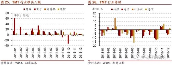 从细分行业来看,12月TMT各行业占比涨跌不一。其中,12月通信占比继续小幅下降0.03%至0.8%,电子占比下降0.3%至6.0%,传媒占比上升0.05%至1.4%,计算机占比与前期持平。
