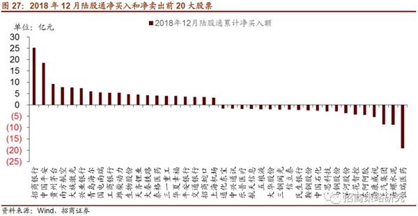 2018年12月,陆股通积极配置银行和非银金融。净买入规模最高的为招商银行,净买入25.25亿元;其次为中国平安,累计净买入18.61亿元。其他净买入额较高的包括贵州茅台、南方航空、大族激光等,净买入额均超过7亿元。净卖出规模最高的为恒瑞医药,累计净卖出19.17亿元。其他净卖出规模较高的包括海螺水泥、上汽集团、海康威视等,净卖出额均超过5亿元。