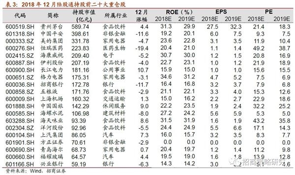2018年12月末,陆股通前二十大重仓股仍然以消费和金融行业龙头为主。前二十大重仓股持股市值占总持股规模的比例为54%,较11月的54.8%有所下降。