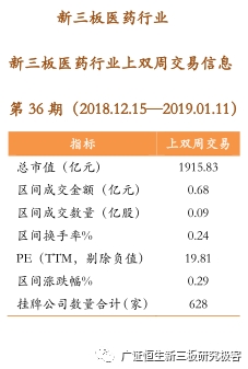 上双周(1201-1214)新三板医药行业总成交量为0.09亿股,较上上双周环比上升11.50%。总交易额0.68亿元,较上上双周环比下降1.41%。上双周医药行业PE为19.81倍,与上期的20.08相比有所下降。本期新三板医药行业2家企业发布定增预案,12家企业发布并购重组预案,新增0家挂牌公司。