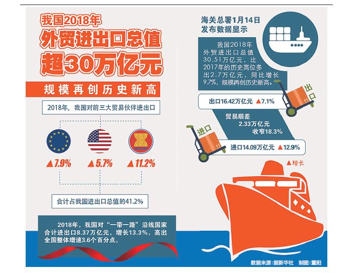 据海关统计,2018年,我国外贸进出口总值高达30.51万亿元人民币,比2017年增长9.7%。其中,出口16.42万亿元,增长7.1%;进口14.09万亿元,增长12.9%;贸易顺差2.33万亿元,收窄18.3%。总体来看,2018年,我国外贸实现了稳定增长,进出口规模达到新的历史高点,质量效益进一步提高,有望继续保持全球货物贸易第一大国地位。