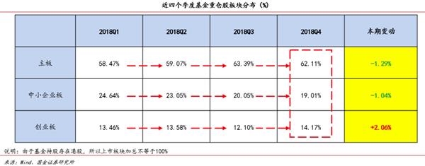 Q4基金配置风格:减仓主板、中小板,增仓创业板。1)主板仓位:本季度由增转减,Q4配置比例为62.11%,较上期下降了-1.29%;2)中小板仓位:减仓趋势已持续10个月,Q4配置比例为19.01%,较上期下降了-1.04%;3)创业板仓位:本季度由减转增,Q4配置比例为14.17%,较上期增加了了+2.06%。