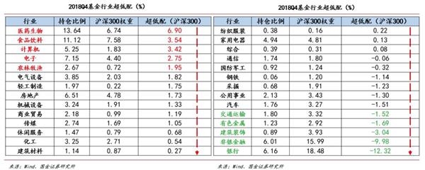 以沪深300权重作为基准,“医药生物、食品饮料、计算机、电子、农林牧渔”等行业获得超配,超配比例分别是6.90%、3.54%、 3.42%、2.75%和1.95%。“有色金属、建筑装饰、非银金融、银行”低配明显,低配比例分别为-1.69%、-3.04%、-9.98%和-12.32%。