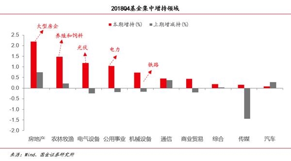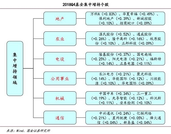 Q4基金增持比例比较高的行业依次为:地产(大型房企)、农业(养殖和饲料)、电设(光伏)、公用事业(电力)、券商、机械(铁路设备)、通信(5G),增持比例分别为2.20%、1.48%、1.19%、1.04%、0.77%、0.75%和0.45%。“地产、农业、券商、通信” 连续两个季度增持。“电设、公用事业、机械”由上季度的减持转为增持。