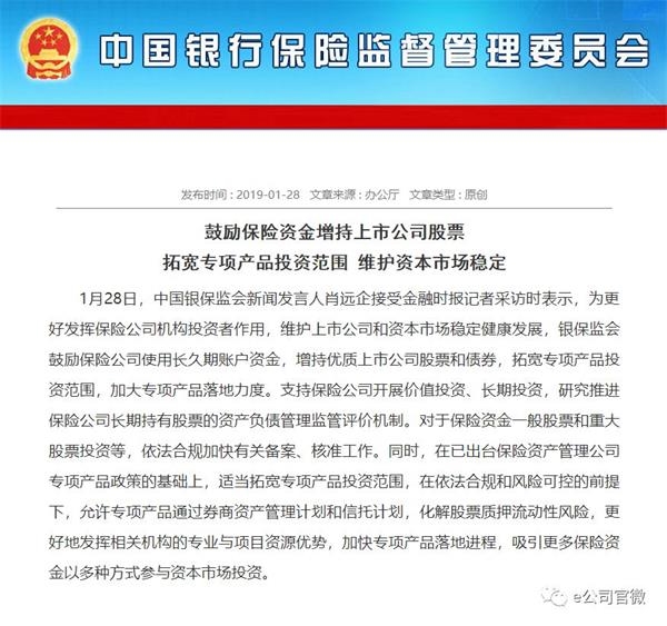 1月28日,银保监会新闻发言人肖远企接受媒体采访时表示,为更好发挥保险公司机构投资者作用,维护上市公司和资本市场稳定健康发展,银保监会鼓励保险公司使用长久期账户资金,增持优质上市公司股票和债券,允许专项产品通过券商资产管理计划和信托计划,化解股票质押流动性风险。