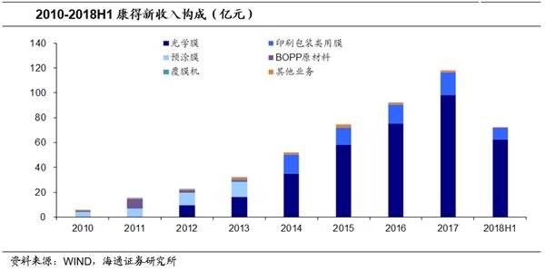 光学膜龙头企业。康得新成立于2001年,作为一家材料高科技企业,主要从事高分子材料的研发、生产和销售,包括新材料、智能显示和碳材料。从收入构成上看,2012年开始光学膜逐渐占据公司收入的重要地位,2018H1光学膜收入占总营业收入的86.58%。