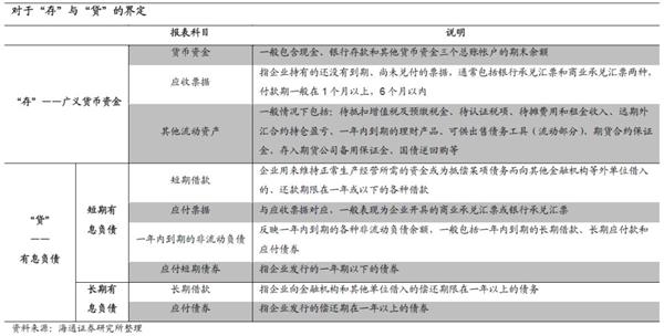 存贷双高中“存”的定义。存贷双高指公司账面显示的货币资金与有息负债同时处于较高水平。“货币资金”科目中的非受限部分一般是公司可以自由动用的资金,除此之外,许多公司购买的理财产品计入“其他流动资产”科目,“应收票据”一般包括商业承兑汇票和银行承兑汇票,变现能力也较强。因此我们定义这里的“存”为广义货币资金,数额等于货币资金、应收票据和其他流动资产三个科目的总和。下文提到的货币资金均指广义货币资金。