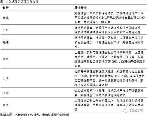 从已公布的省市政府工作报告来看,加大保障性住房供应,“租购并举”完善住房保障体系多被提及。在30个省市的《政府工作报告》中有24个省市提及 “住房保障”,完善住房保障体系已成为多地下一阶段工作重点。其中安徽省计划新开工保障性安居工程21.45万套,北京市计划多渠道建设筹集租赁住房5万套(间)、政策性产权住房6万套,上海市计划新增供应各类保障房8万套。此外天津、福建、广东、北京、上海等省市均提到培育和完善住房租赁市场。重视住房保障,补上保障和租赁的短板是保证房地产市场高质量发展的必经之路。