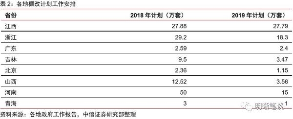 棚改方面继续被提及,但从2018年与2019年的数据对比来看,多地棚改目标下降明显。我们此前在《债市启明系列20181228 ——从专项债看房地产投资,反弹几时有?》中分析过,综合棚改既定的新三年规划和现有进程,未来两年时间棚改的规模有限,难以对2019年的房地产投资形成支撑。从2019年各地方政府工作报告中针对棚改的计划来看,多数省份公布的2019面棚改目标较2018年明显下降,部分省份降幅超过50%,方向上与我们之前报告的结论相符。
