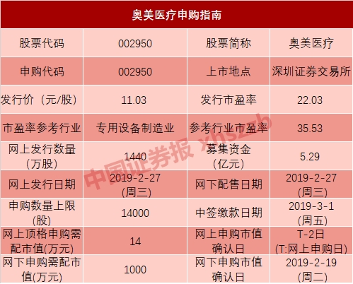 本周只有1只新股申购,就是今天(2月27日)中小板的奥美医疗(申购代码:002950),其发行价为11.03元/股,顶格申购需要深市市值14万元。