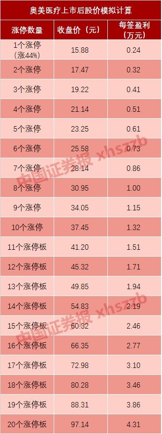 如果奥美医疗上市后,能达到今年以来上市新股的平均水平——6个涨停板的话,则每签获利约为7300元。如果能达到2018年以来上市新股的平均水平——7个涨停板的话,则每签获利约为8600元。