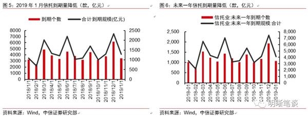 1月信托贷款数据具有一定的偶然性,预计2019年信托贷款到期量显著上升,全年信托贷款负增长将会延续。信托产品期限一般为2年左右,2017-2018年发行信托贷款将大量在2019年到期。由于2017年信托发行规模比2015-2016显著更大,2019年到期规模预计将会明显上升。再加上2019年信托发行量难以大幅增长,新增信托贷款长期仍面临下滑压力。