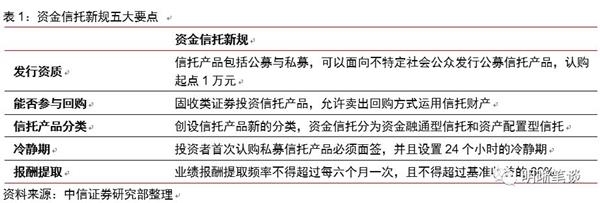 信托新规对信托贷款增速企稳将起到一定的积极作用。资金信托新规提出5大重点补充内容。据证券时报等媒体报道,为对标资管新规相关要求,监管部门正抓紧制定或修订信托行业相关监管制度。由银保监会信托部正在制定的《信托公司资金信托管理办法》(资金信托新规)进一步梳理并明确了具体业务的监管规则,目前已经结束对各省级银监局的征求意见阶段。根据媒体披露,该办法主要包括五大要点:信托产品将被纳入公募,认购起点1万元;信托产品将创设新的分类;投资者首次面签认购私募信托产品将设置24个小时冷静期;固收类证券投资信托产品将允许卖出回购;业绩报酬提取也有细化要求。
