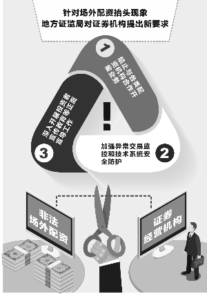 3月7日,针对近期市场反映场外配资有所抬头的情况,广东证监局召集辖区相关证券营业部负责人座谈,了解证券经营机构所掌握的场外配资的模式、对象、趋势等情况,并对证券经营机构防范场外配资风险提出明确要求:一是禁止与各类配资机构合作开展业务;二是加强异常交易监控和技术系统安全防护;三是深入开展投资者宣传教育等正面宣导工作。