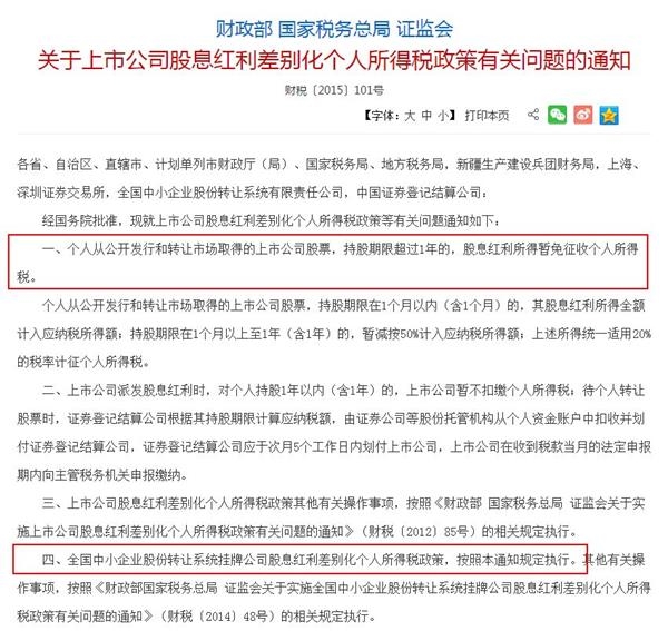 不过,按照2015年9月财政部、国家税务总局、证监会发布的《关于上市公司股息红利差别化个人所得税政策有关问题的通知》(财税〔2015〕101号),个人从公开发行和转让市场取得的上市公司股票,持股期限超过1年的,股息红利所得暂免征收个人所得税,新三板公司股息红利差别化个人所得税政策,也按照执行。