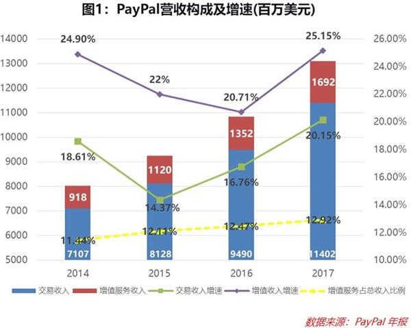 “支付+增值服务”模式的这条路有很多人在走,但是还没有看到哪家真正做成功。对于缺少场景、资金、技术实力的独立支付机构来说,更是尤为艰难。这一点,从国际支付巨头PayPal的营收构成就可窥见一斑(参见下图)。国内号称“支付行业第一股”的汇付天下,其金融科技服务收入也只占其营收不到5%的比例。