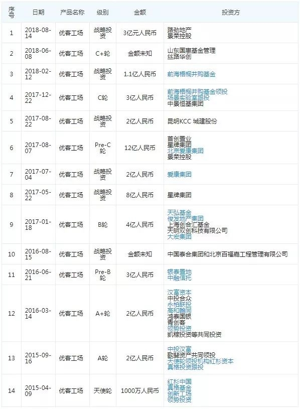 频繁的融资,是估值疑云密布的根源。截至目前,优客工场完成D轮融资(2018年11月),融资金额2亿美元(见下表)。