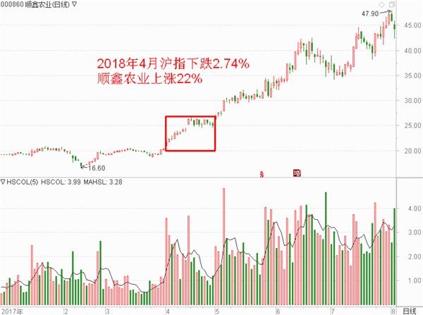 同样的道理,2018年的大牛股顺鑫农业在4月份的表现也是强于沪指的,火山君截图展示: