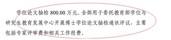 在预算安排上,2019年学位论文抽检预算为800万元,全部用于委托教育部学位与研究生教育发展中心开展博士学位论文抽检通讯评议,主要包括专家评审费和相关工作经费。