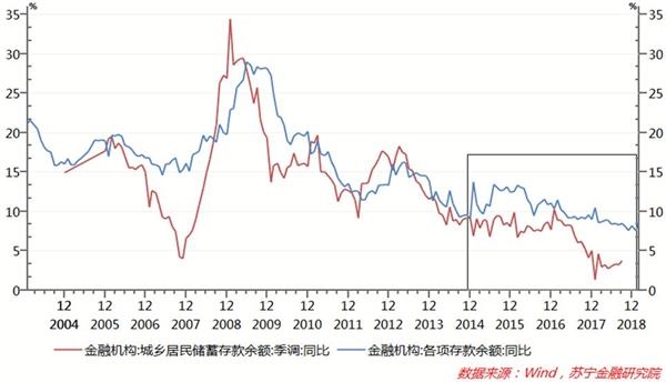 2012年以来,城乡居民储蓄存款余额增速虽然存在波动,但整体不改持续下行趋势,特别是在2015年之后,城乡居民储蓄存款的增速,持续低于金融机构存款余额的整体增速(参见下图)。