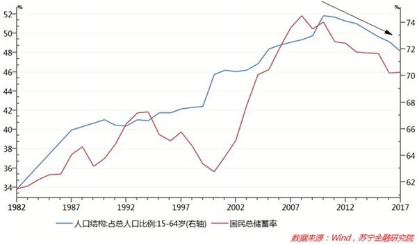 第一,人口老龄化是储蓄率下滑的长期推动力。一般而言,老年人在国民经济中属于“消费型”人口,老龄化社会的到来必然会提升居民的消费率,降低储蓄率。事实上,正是在2009年我国15-64岁人口比重达到峰值逐步下降之后,国民储蓄率出现了几近同步的下行趋势。