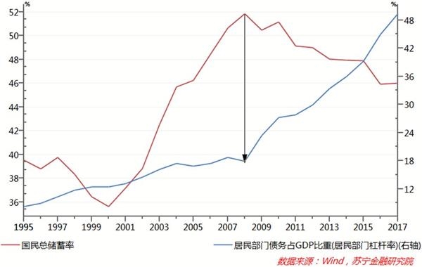 从居民部门整体负债水平变化趋势看,2009年居民杠杆率加速上升时期,也正是国民储蓄率迈过拐点、进入下行周期的阶段(参见下图)。