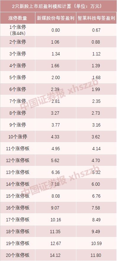 如果新媒股份和智莱科技上市后,能达到今年以来上市新股的平均水平——7个涨停板的话,则每签获利分别约为2.81万元、2.35万元。值得注意的是,新媒股份和智莱科技的发行市盈率相比同行业都存在较高的折价,如果达到行业市盈率,新媒股份需要约7个涨停,智莱科技需要约8个涨停。
