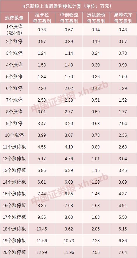 数据显示,今年以来沪深两市共有36只新股上市,32只已开板新股的平均一字涨停板数量为7.47个。2月至今,两市共有22只新股上市,18只已开板新股平均收获了8.78个一字涨停板。如果拉卡拉、中创物流、运达股份、泉峰汽车上市后,能达到今年以来上市新股的平均水平——7个涨停板的话,则每签获利分别约为2.58万元、2.38万元、0.51万元和1.52万元(按9.79元/股计算)。