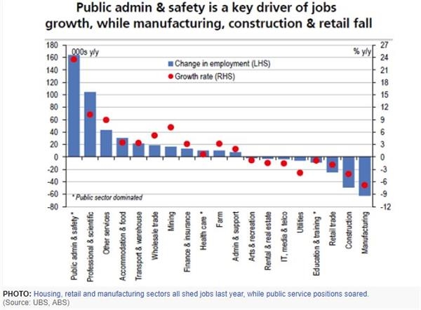 (公共管理和安全领域是就业增长的关键驱动,而制造业、建筑业和零售出现下滑,来源:ABC News)