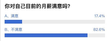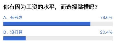 调查发现,82.6%的网友对自己目前的月薪不满意。还有79.6%的网友表示因为自己的工资收入,有考虑选择跳槽。