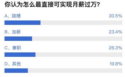 而调查还发现,超过三成受访网友认为,跳槽是最直接可实现月薪过万的方式。