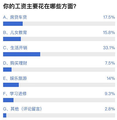 根据热点站站队的调查数据显示,网友们的工资主要花在生活开销上,占了33.1%,其次是房贷车贷和儿女教育,分别占17.5%和15.8%。其中,选择把工资花在购买理财的人数只占7.7%,《2019国人工资报告》也指出五成受访者用于理财的钱不足工资20%,可看出国人理财意愿偏低。