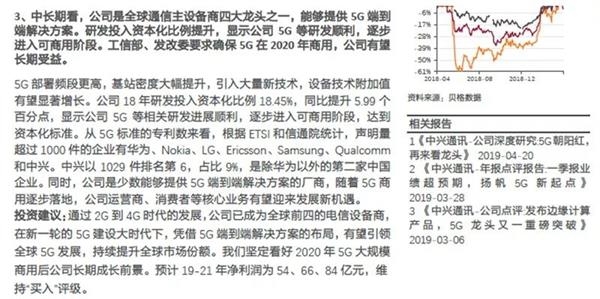 国盛证券认为,中兴仍是全球5G的主要玩家。5G时代将不再是简单的设备销售,而是系统的数字化赋能,中兴的端到端解决方案提供能力将进一步发挥。天风证券认为,中长期看,公司是全球通信主设备商四大龙头之一,能够提供5G端到端解决方案。研发投入资本化比例提升,显示公司5G等研发顺利,逐步进入可商用阶段。随着5G商用逐步落地,公司运营商、消费者等核心业务有望迎来发展新机遇。