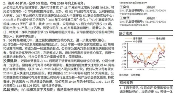 天风证券认为,公司作为国内乃至全球基站天线的领导者,随着公司海外市场扩展顺利,叠加国内因流量快速增长对4G网络的扩容需求增加,以及5G在2019年将进入逐步放量阶段,预计公司有望在2019年进入快速向上的新阶段。