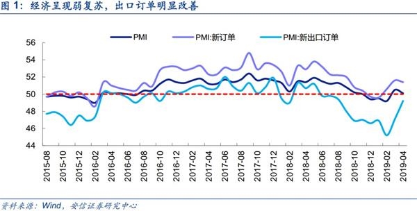 4月PMI回落,结构优化较总量增长更为重要。整体来看4月PMI较3月有所回落,但仍处于荣枯线以上,经济呈现弱复苏。出口订单呈现明显改善,这也意味着短期稳增长的压力有所缓解。小型企业活力提升,民企支持政策初显成效。中国统计局4月30日发布数据显示,2019年4月份,中国制造业采购经理指数(PMI)为50.1%,环比3月回落0.4个百分点,但仍落在荣枯线之上,整体经济呈现弱复苏格局。其中反映外需的新出口订单指数为49.2%,较前月的47.1%大幅上升2.1个百分点,创下2018年8月以来新高。