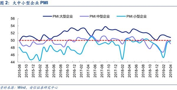 大中型企业回落,小型企业活力提升,民企支持政策初显成效。从结构上看,大型企业和中型企业PMI分别为50.8%和49.1%,较前月回落0.3和0.8个百分点。小型企业PMI为49.8%,虽位于临界点以下,但比上月回升0.5个百分点,为2018年10月以来高点,特别是生产指数为51.2%,已连续两个月位于扩张区间。这些表明近期出台的一系列精准有效的减税降费及支持小微企业健康发展的政策措施效果逐步显现,小型企业生产经营状况有所改善。