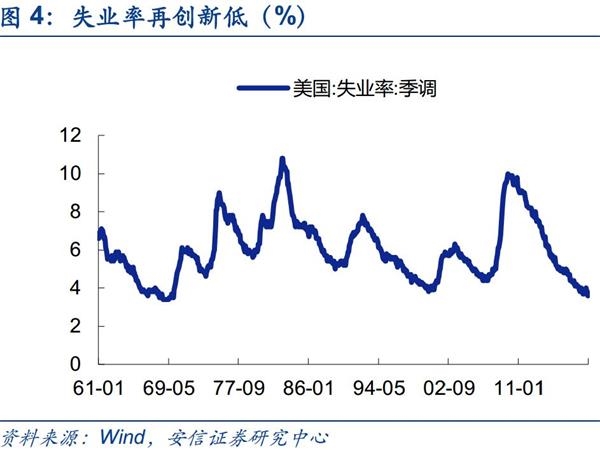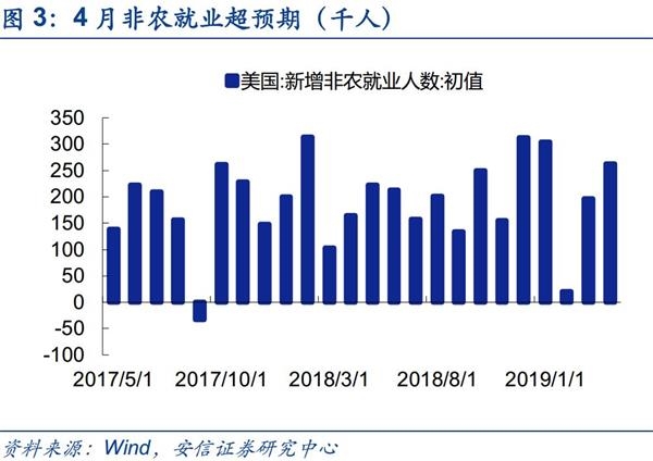 北京时间5月3日晚间,美国劳工部公布的数据显示,4月非农就业人口增加26.3万人,创3个月新高,预期为19.0万人。美国3月非农就业人口由19.6万人修正为18.9万人,2月由3.3万人修正为5.6万人,失业率则降至3.6%,为1969年以来的新低。这一数据也印证了前日美联储在4月议息会议声明中提及的,将对经济的描述上调为“经济活动增速保持稳健”,对通胀走势的描述下调为:整体和核心通胀均已下滑,保持在2%的联储目标下方。会后的新闻发布会上,鲍威尔表示,美联储认为现在的政策是适合的,并没有看到加息或是降息的很大可能性,我们认为这预示了美联储在六月议息会议大概率按兵不动,在下半年降息的概率依然很低。