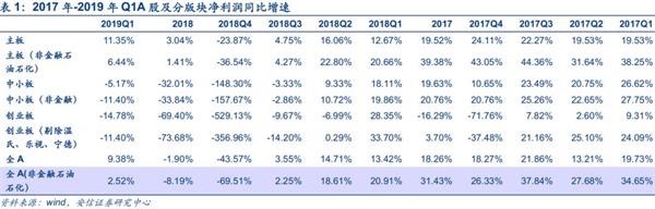 2018年A股剔除金融石油石化后,盈利负增长8.19%,2019Q1小幅转正至 2.52%,超越市场预期,这点我们在上周周报中已做出提示。根据18年报和2019一季报,2019Q1全A归母净利润增速为9.38%,相较于2018Q4的(全年为-8.19%,单季度为-43.57%)出现大幅上升,进一步,A股剔除金融两油后归母净利润增速为2.52%,较2018Q4(单季度为-69.51%)大幅上升。2018年全A(非金融石油石化)归母净利润已经陷入负增长,2019Q1着实现小幅正增长。