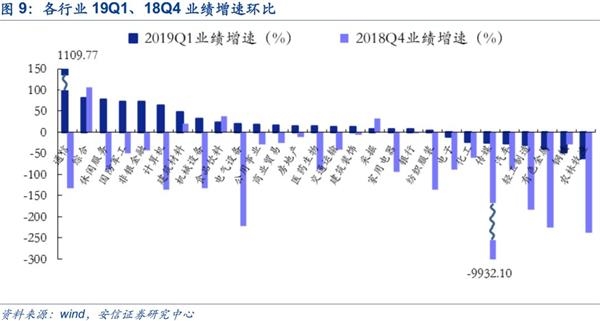 根据2018年年报和季报归母净利润同比增速来看,分行业来看,18年A股盈利贡献主要依然来自上游资源品和地产行业,中游制造、下游消费、金融以及TMT盈利表现均不好。而19Q1盈利结构发生明显的变化,盈利贡献主要来自金融、下游必须消费,其中非银金融、机械设备、军工、计算机、地产等领域增速靠前,拖累主要是因为上游资源品业绩增速的回落。其中,在成长行业领域依然呈现分化格局,电子、通信、军工、医药要好于计算机和传媒。从同比增速环比变化来看,较2018Q4明显提升的行业主要是成长型行业,传媒(9907.92pct,2018Q4大幅负增长导致)、通信(1242.47pct,2018Q4大幅负增长导致)、计算机(198.40pct)、军工(120.91pct)、医药(100.42pct)、电子(76.13pct)均呈现明显的业绩修复。