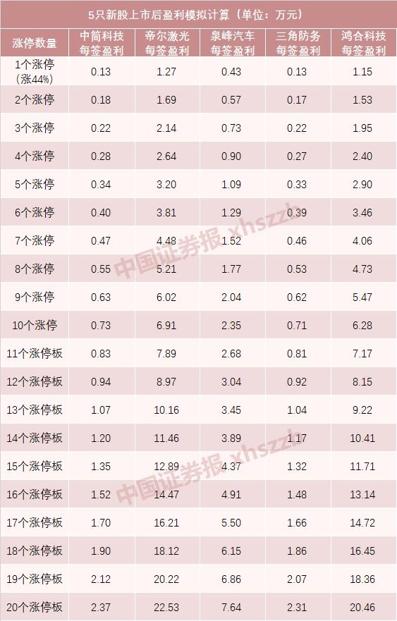 如果中简科技、帝尔激光、泉峰汽车、三角防务、鸿合科技5只新股上市后,能达到今年以来上市新股的平均水平——7个涨停板的话,则每签获利分别约为0.47万元、4.48万元、1.52万元、0.46万元、4.06万元。