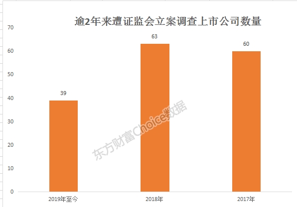 不完全统计显示,2019年至今还未过半,已经有39家上市公司或相关人员被证监会立案调查;而2018年和2017年全年这一数字分别为63家和60家。