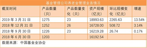此外,根据披露的一季度基金管理公司及其子公司私募资产管理业务规模,截至3月31日,基金管理公司管理养老金产品达1275只,管理资产规模为18993.63亿元。相较于2018年末,养老金产品数量增加23只,规模环比上涨2265.63亿元。