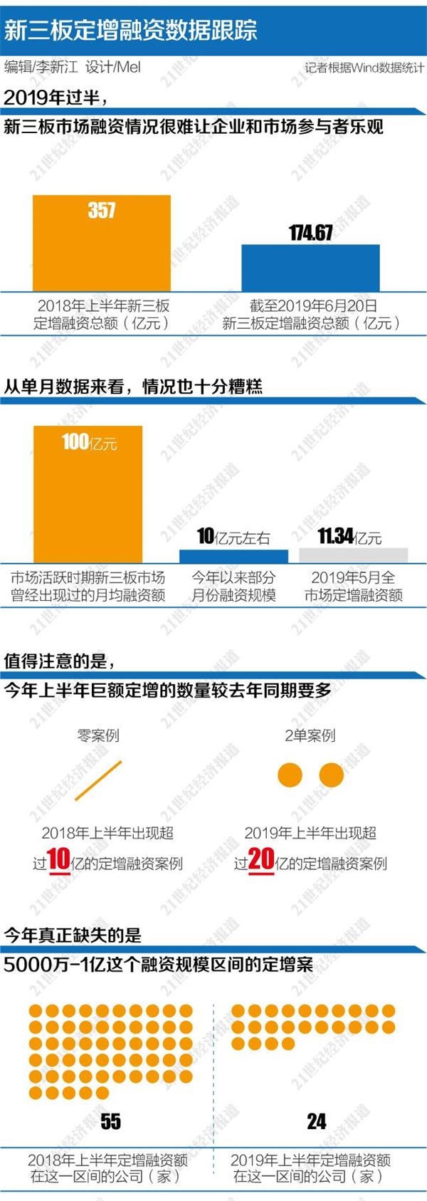 根据全国股转系统官方数据和数据显示,2019年截至6月20日定增融资总规模尚不足200亿元,这一数据不足市场火热时期一个月的融资额度。