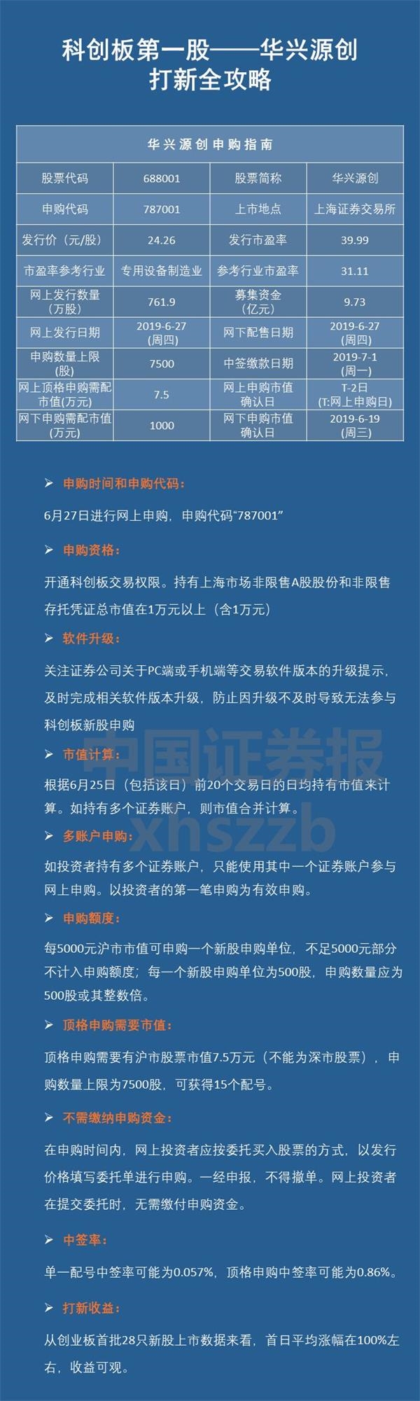 华兴源创,股票代码为688001,申购代码为787001,发行价为24.26元/股,网上申购数量上限为7500股,顶格申购需要沪市市值7.5万元,中签缴款日为7月1日(下周一)。
