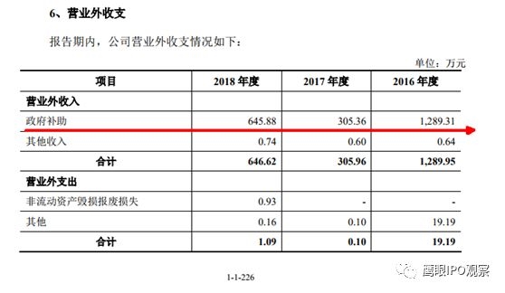招股说明书207页披露,2017年、2018年,计入当期损益的政府补助为306.50万元、647.87万元,但在226页,上述数据变成了305.36万元和645.88万元;到了招股书250页,2017年和2018年,政府补助金额又变成了256.50万元和805.49万元。