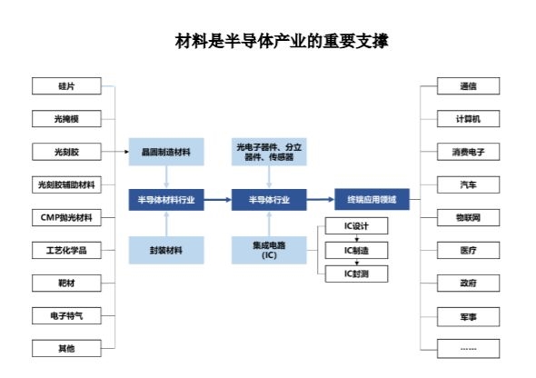 据了解,由于半导体行业具有“技术依赖于工艺,而工艺依赖于材料和设备”的特点,处于产业链上游的半导体材料对整个产业的发展起着重要的支撑作用,决定了半导体产品的质量与性能,也是推动下游各大应用创新的引擎。