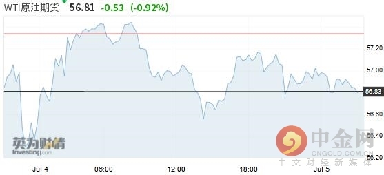 布伦特原油近月期货下跌0.52美元,或0.81%,收报每桶63.30美元。周三布伦特原油收涨2.3%。美国原油期货下跌0.54美元,或0.94%,至每桶56.89美元。周三美国原油收涨1.9%。因7月4日美国独立日假期,市场成交量清淡。