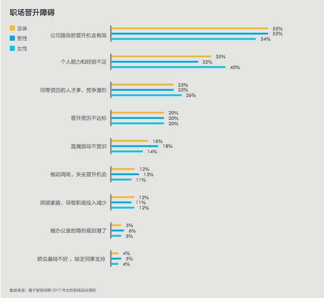 报告称,不管身居何位,女性群体都认为公司提供的晋升机会有限成为她们晋升中的最大障碍。基层管理人员以下级别女性对于个人能力和经验不足感知更为强烈,而中层管理级别以上的女性则对于照顾家庭导致职场投入减少的体验更加深刻。