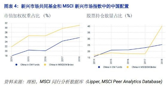 进一步来看,全球股票共同基金对A股更是低配。在2018年完成部分纳入后,MSCI ACWI全球指数中每6只股票中就有1只是中国股票。相比之下,全球股票共同基金所持有的股票中,每30只股票才约只有1只是中国股票。